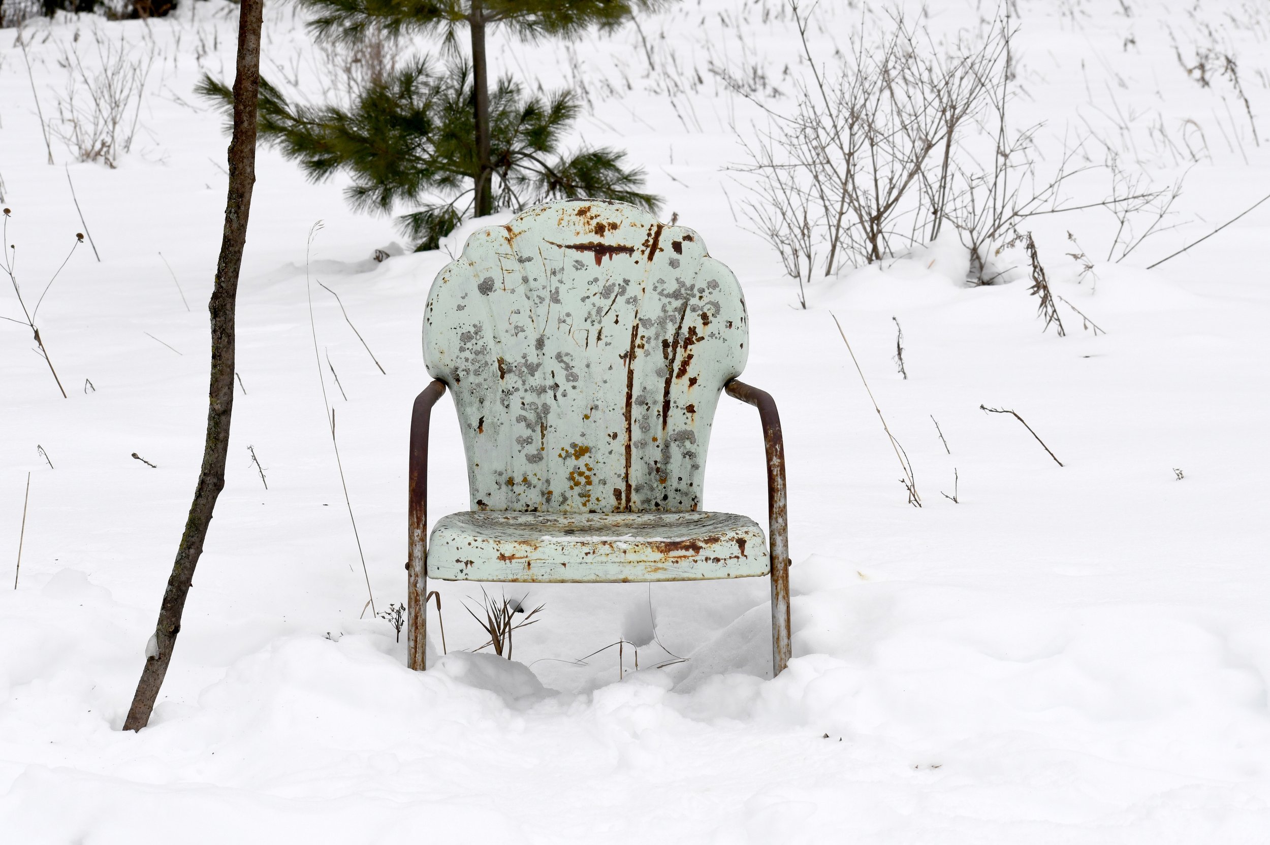 An old, weathered metal chair with rust spots, sitting alone in the snow outdoors, surrounded by a few small bushes and a small pine tree.