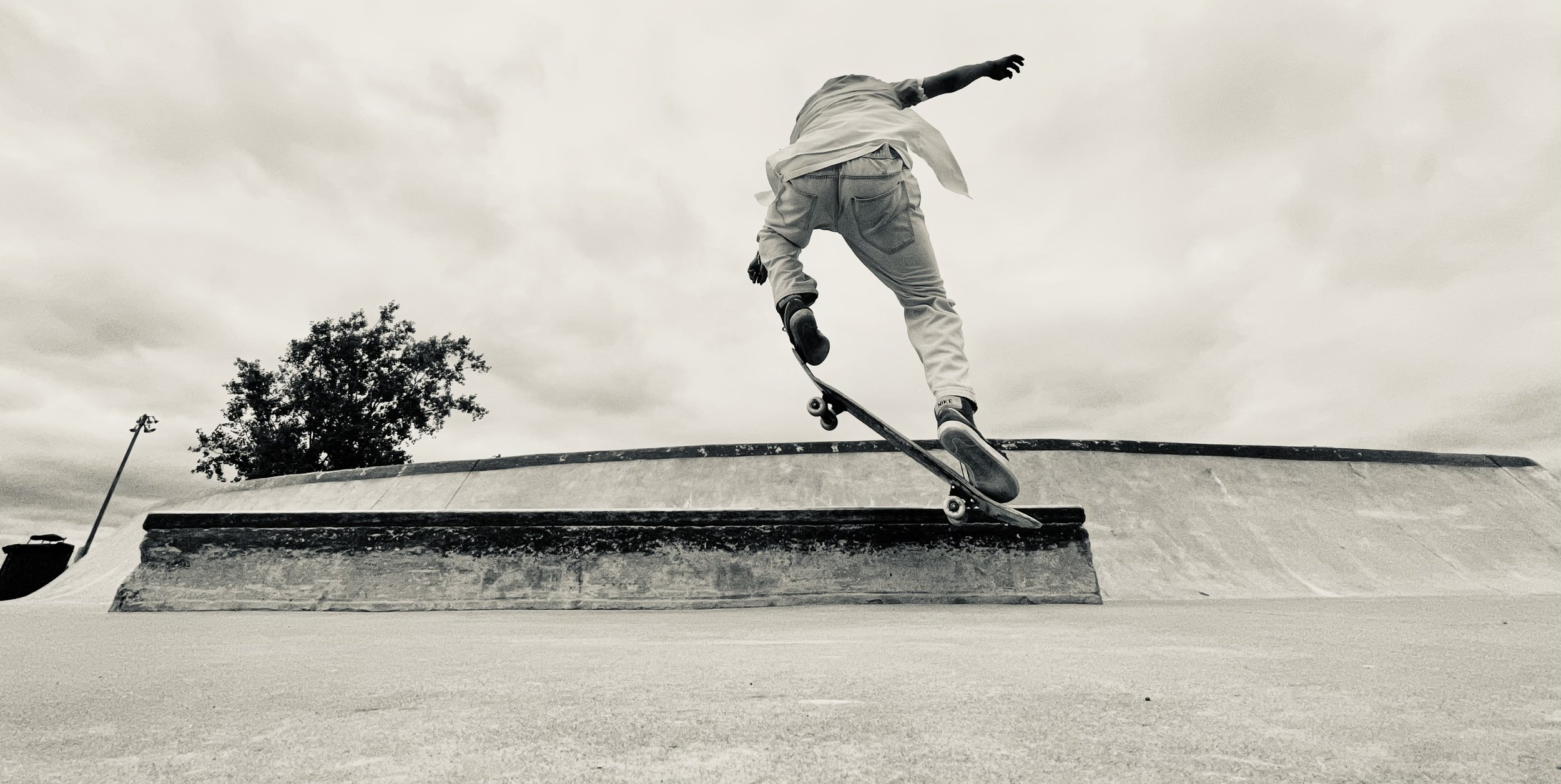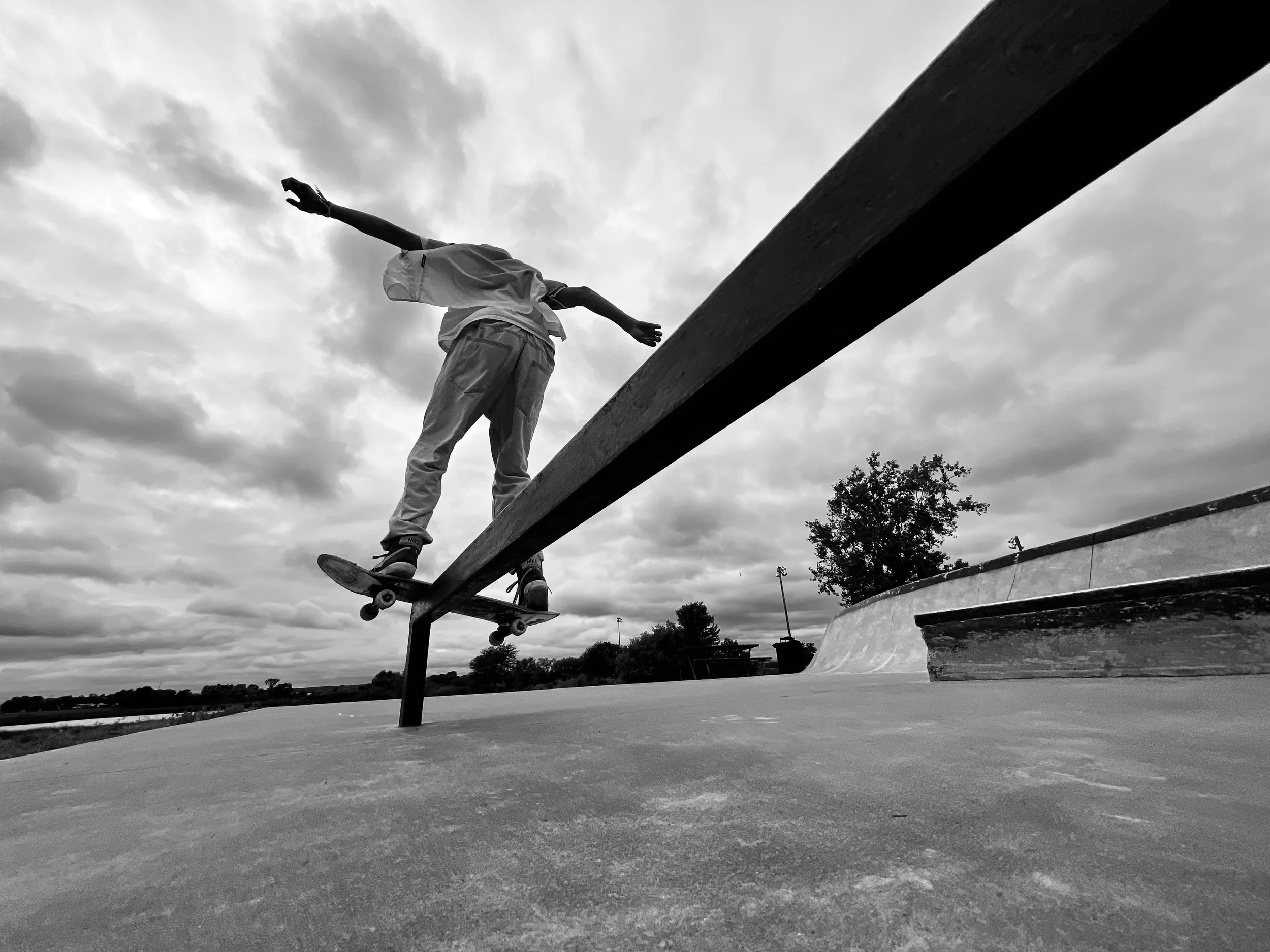 Close-up of a person skateboarding outdoors on a concrete skatepark with grass and trees in the background, cloudy sky, in black and white. View fullsize