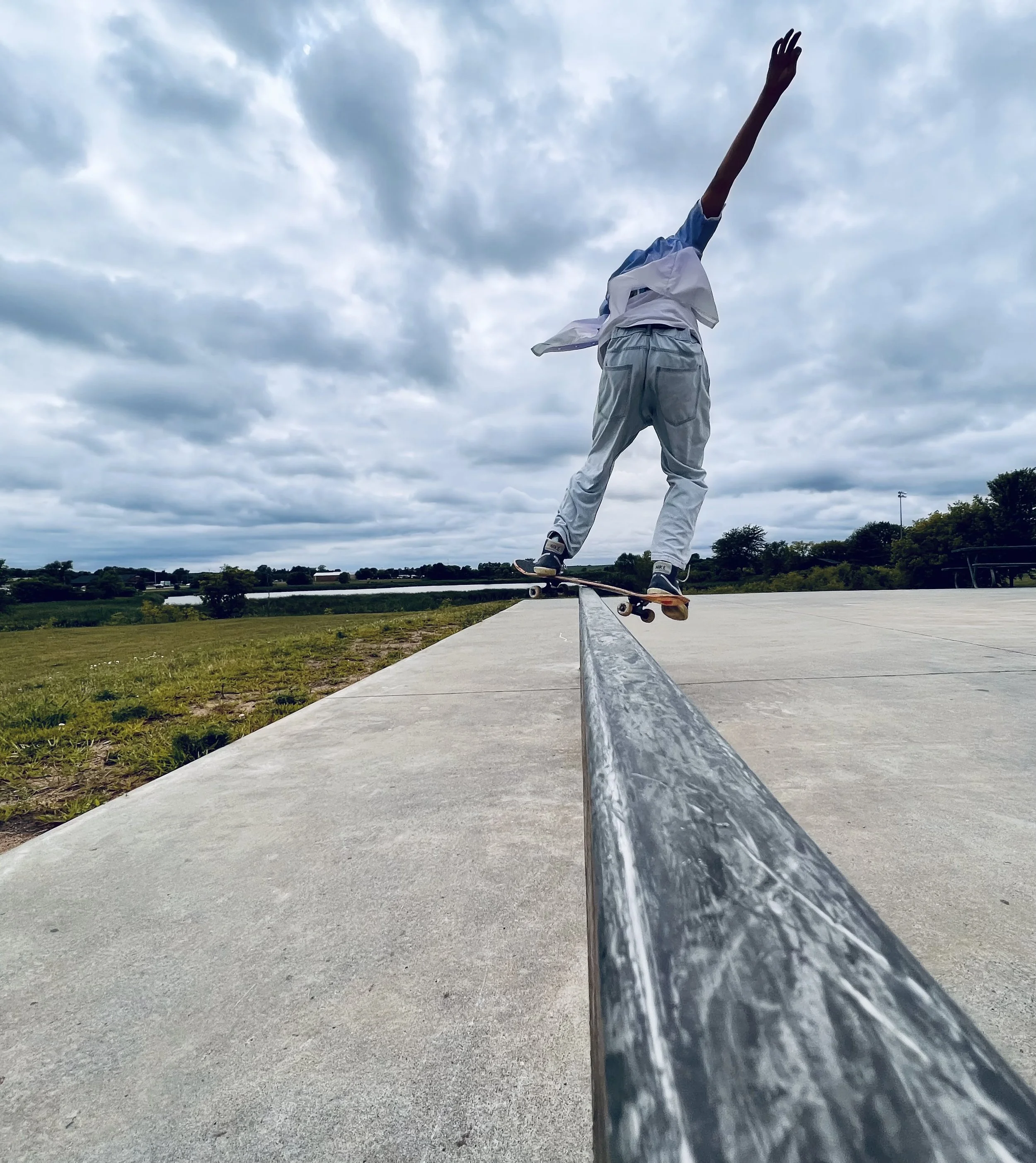 A person skateboarding on a rail at a skate park, with cloudy sky and athletic fields in the background. View fullsize