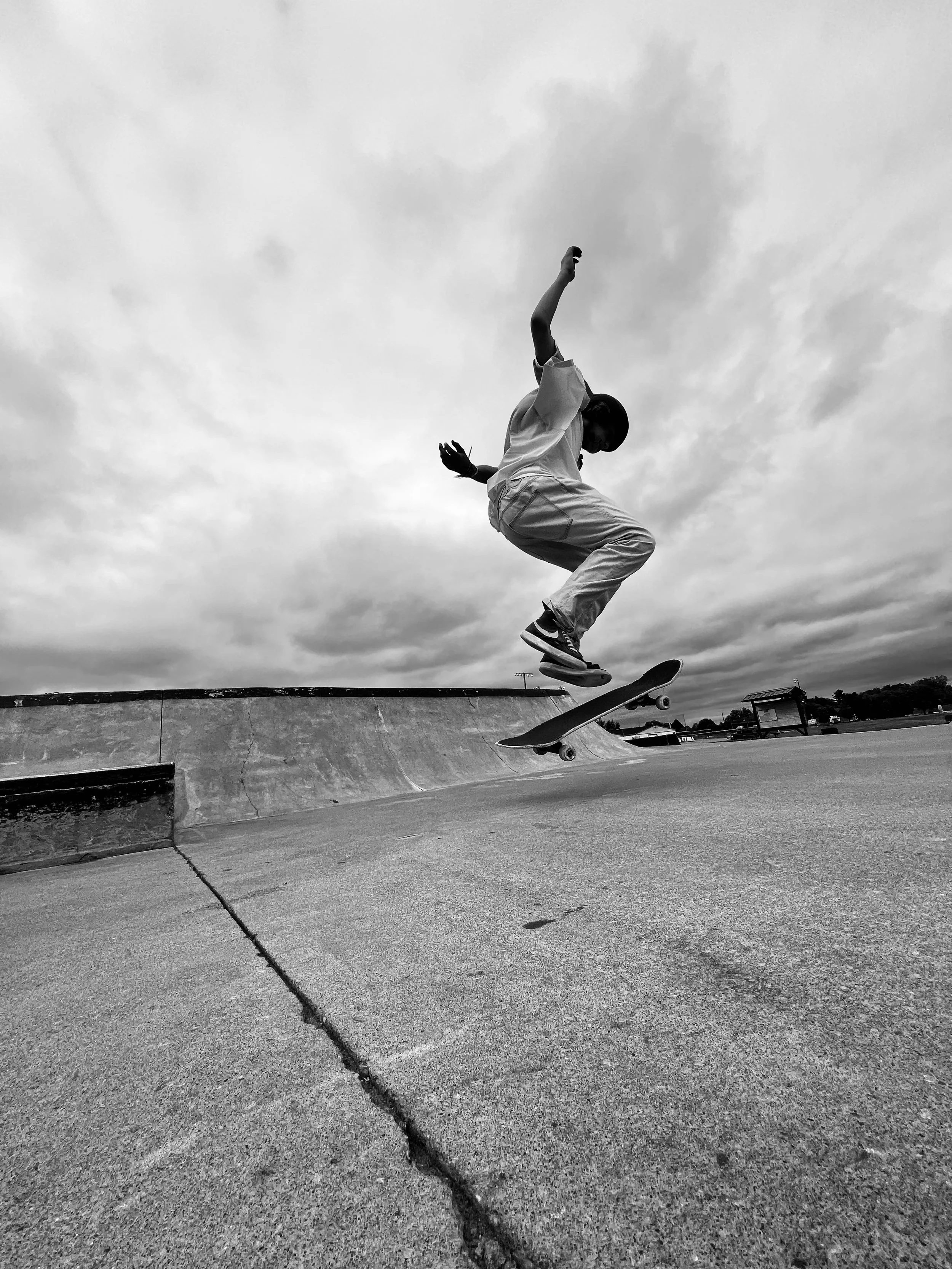 A skateboarder performing a trick at a skate park on a cloudy day, mid-air above a concrete ramp. View fullsize