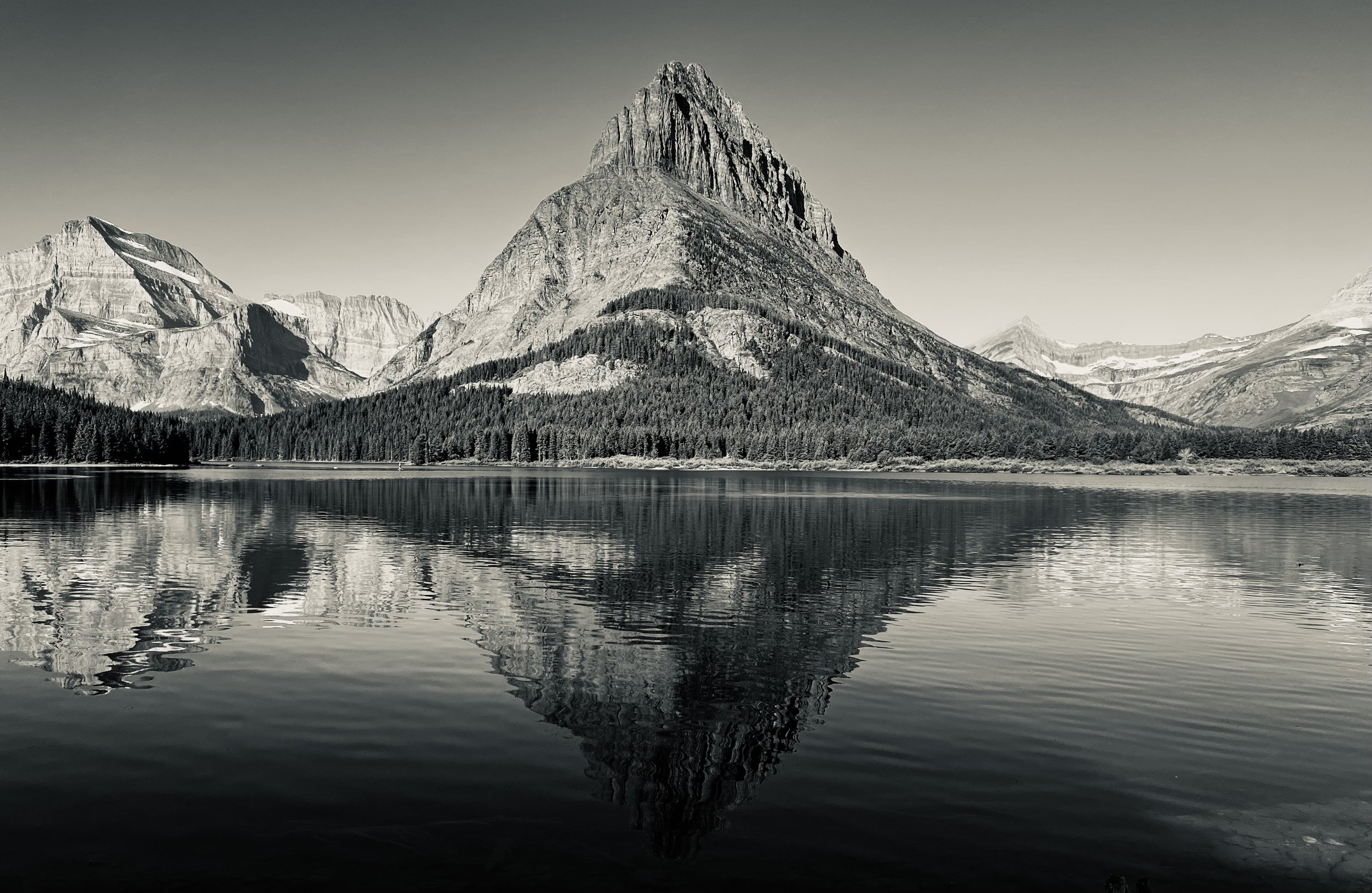 Black and white photo of a mountain and its reflection in a calm lake. View fullsize