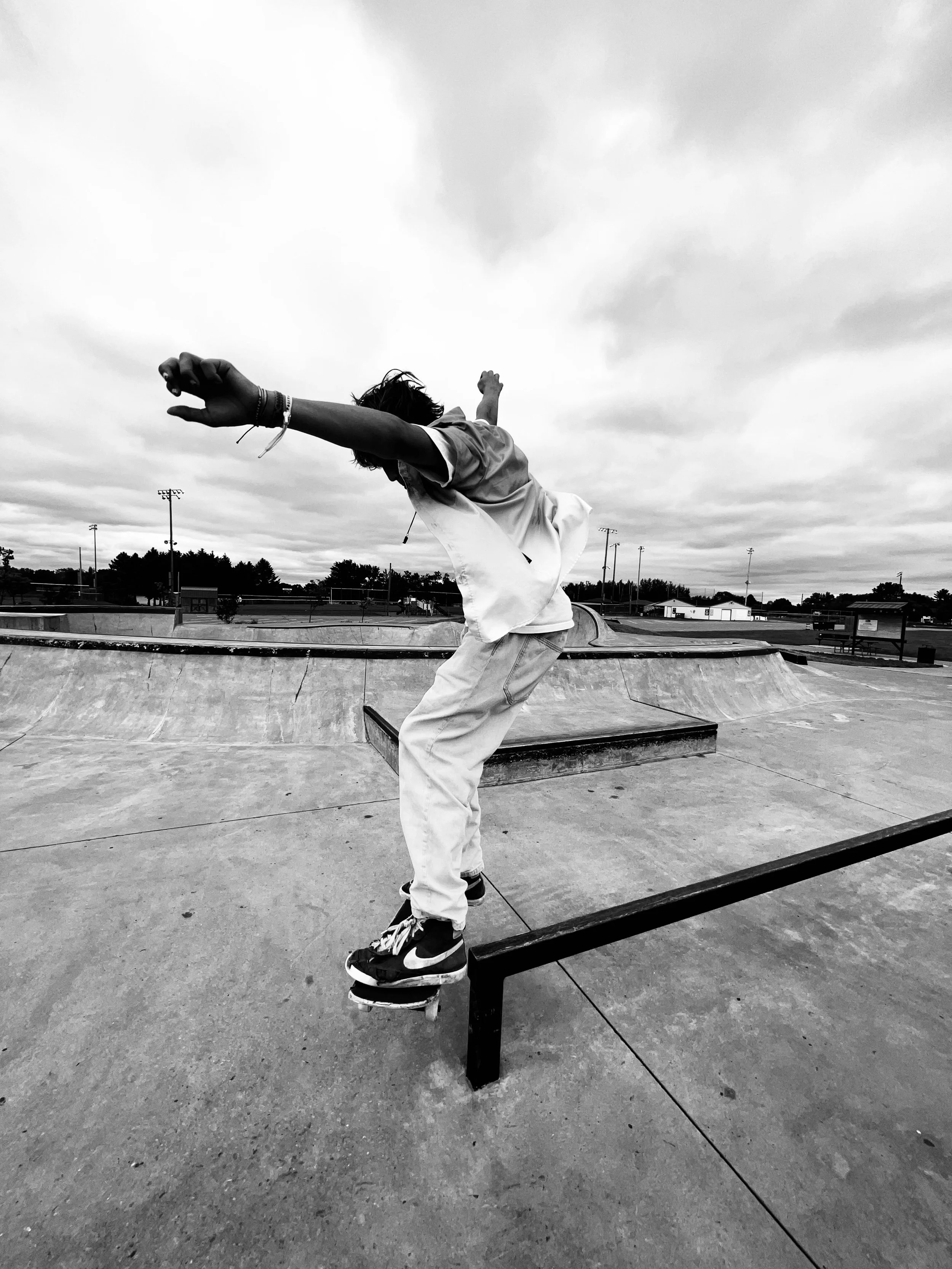 A person skateboarding at a skate park on a cloudy day. View fullsize