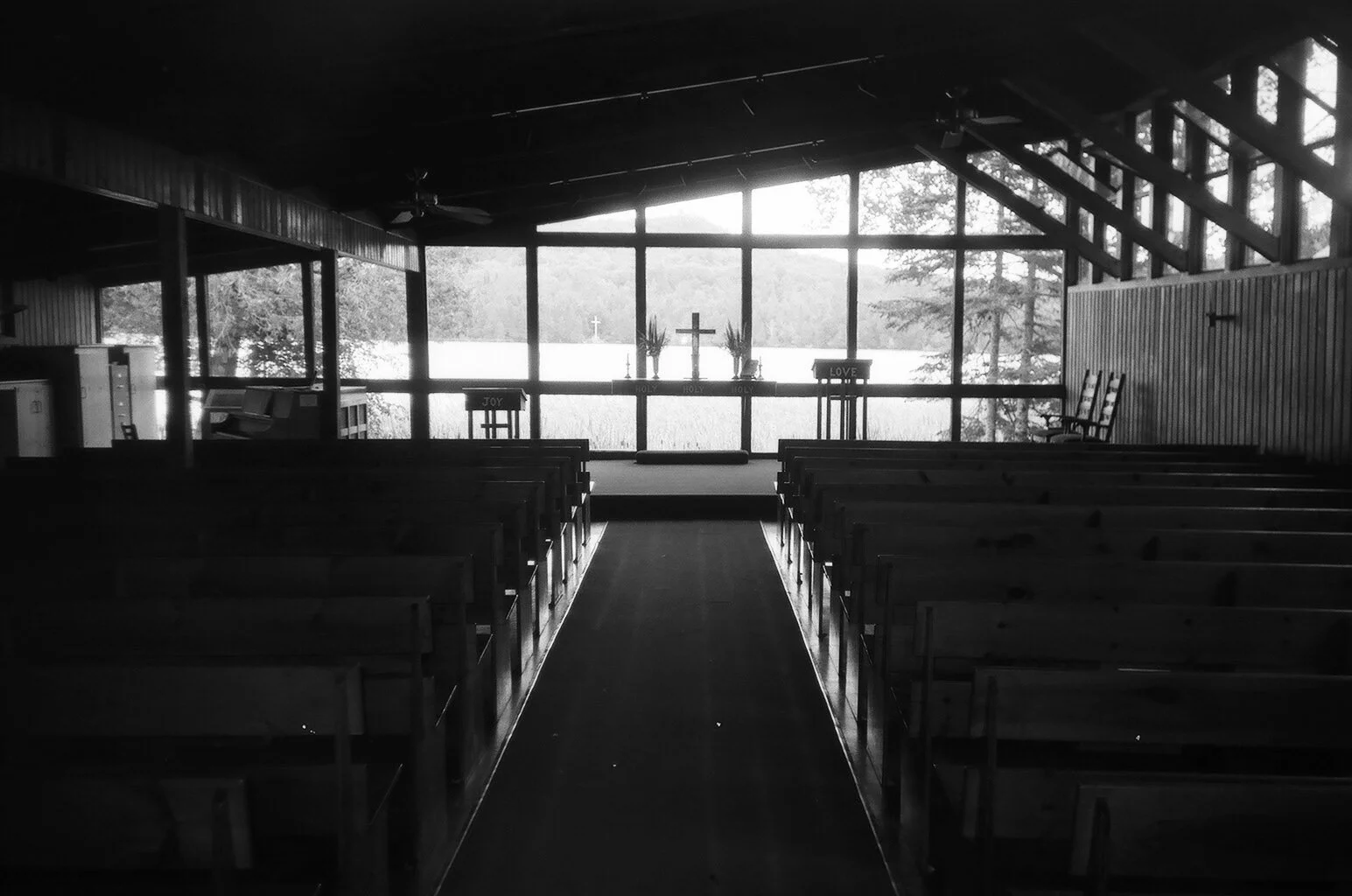Inside view of a church with wooden pews, a pulpit, and altar at the front with a cross and flowers, large glass windows letting in natural light, and a painted cross in the distance outside.