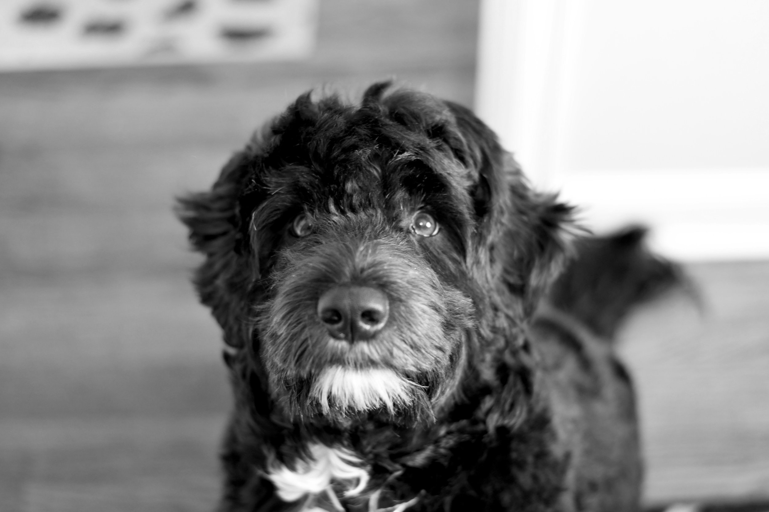 A close-up black and white photo of a fluffy dog with a white patch on its chin, looking directly at the camera.
