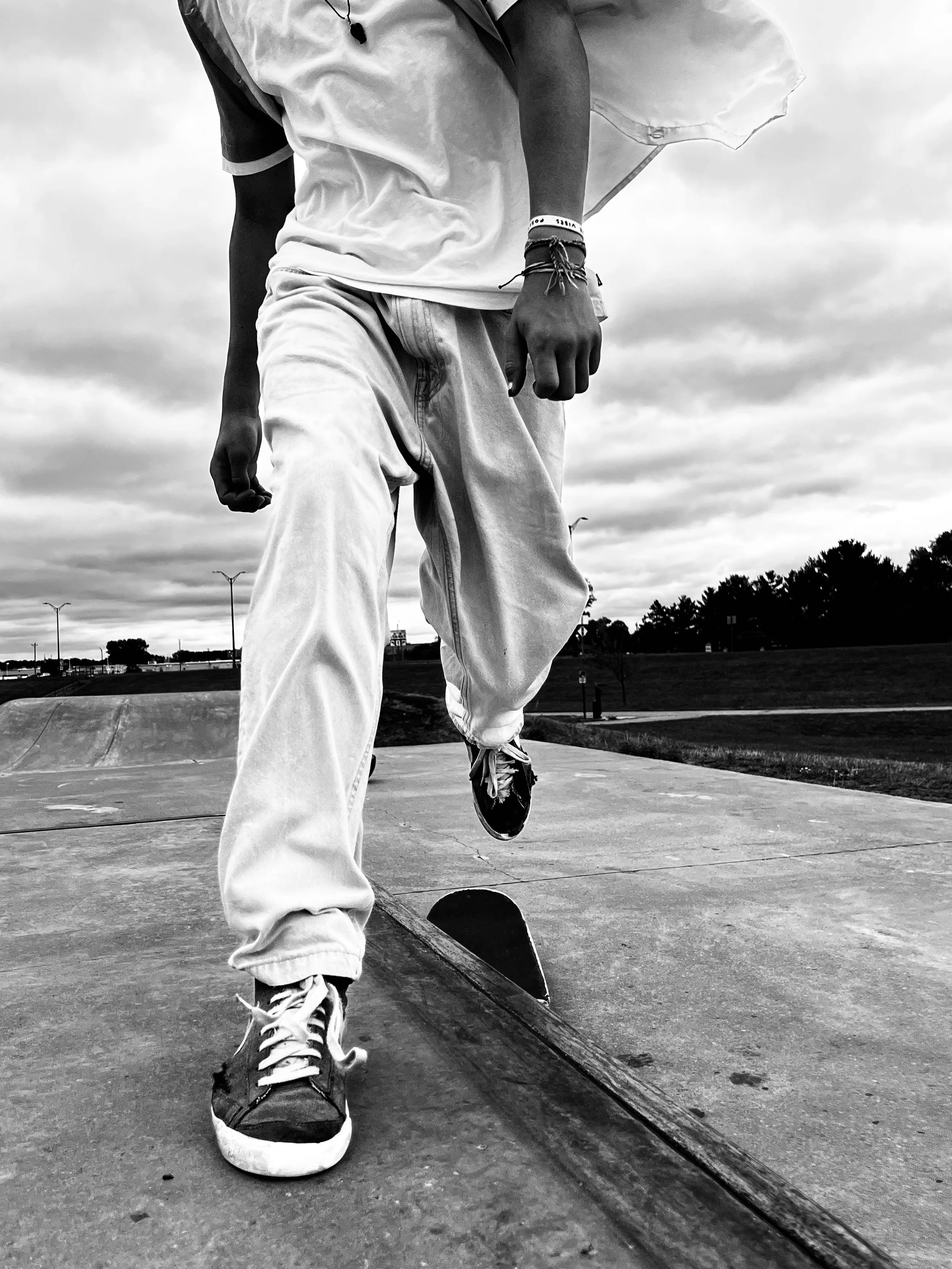 Close-up of a person skateboarding outdoors on a concrete skatepark with grass and trees in the background, cloudy sky, in black and white.